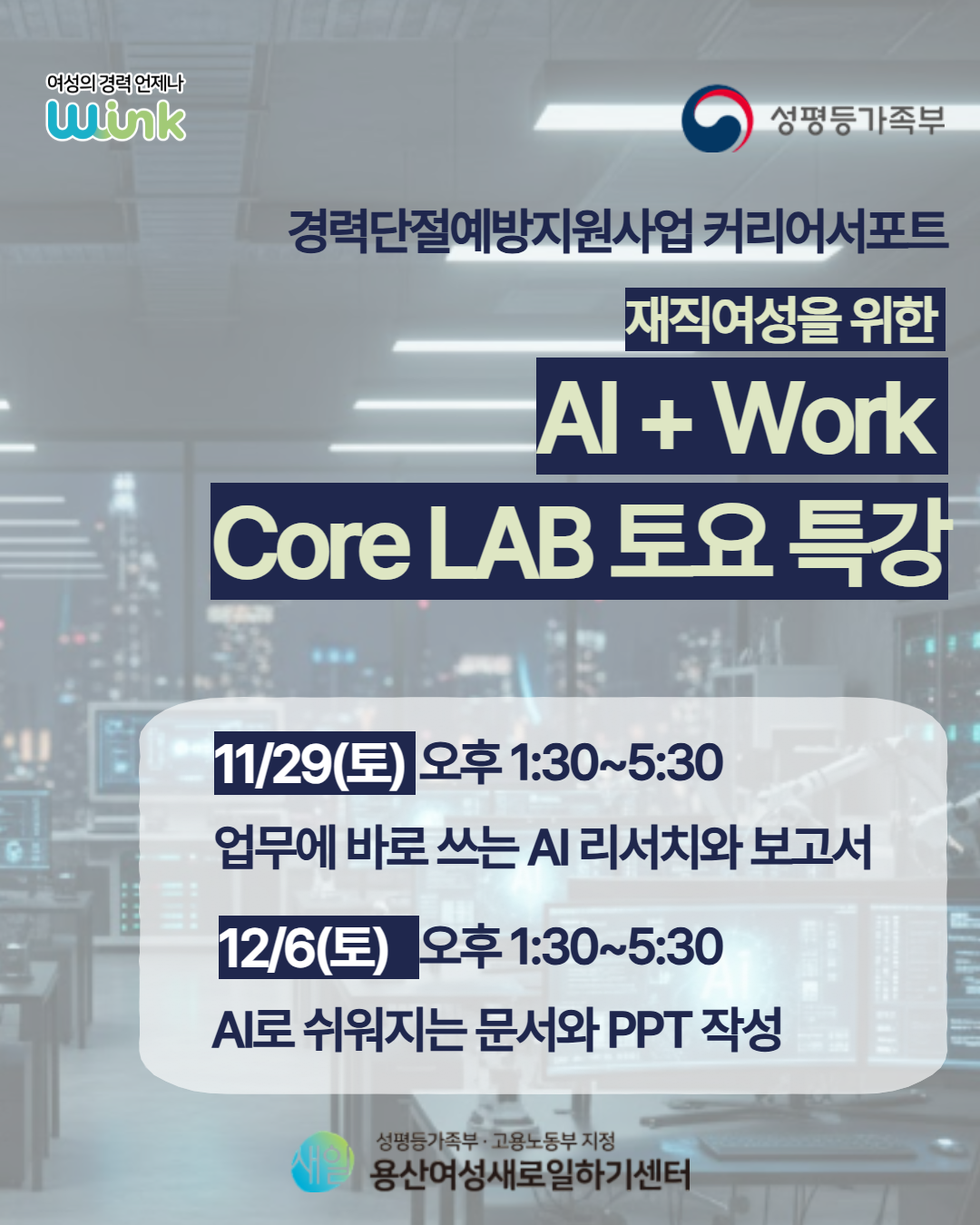 ★접수대상: 재직여성(경력단절예방지원사업으로 커리어코칭 참여자 및 30·40여성 우선선발)