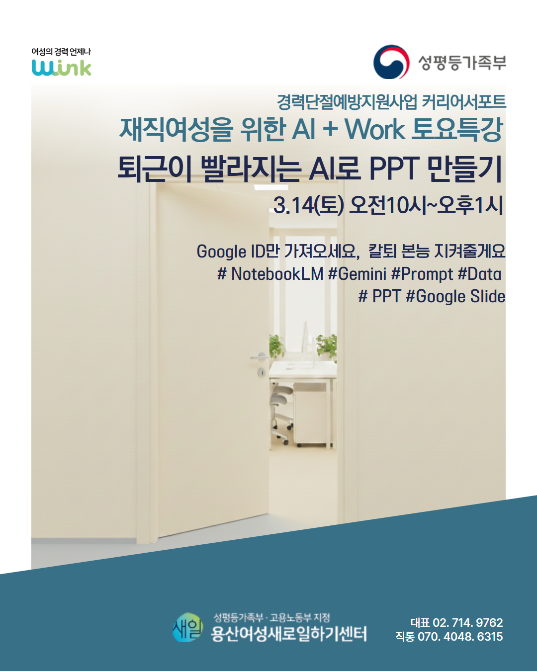 ★접수대상: 재직여성(경력단절예방지원사업으로 커리어코칭 참여자 및 30·40여성 우선선발)
